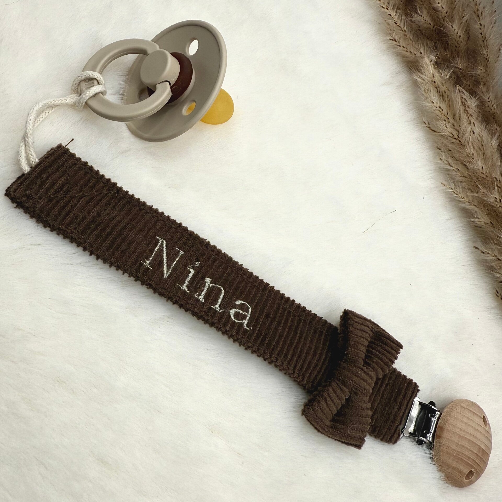 Dit gepersonaliseerde speenkoord van Bij Noe is een echte eyecatcher! Gemaakt van zachte bruine ribstof en afgewerkt met een schattige strik. geborduurd met naam naar keuze. Dankzij de stevige houten speenclip blijft het speentje altijd binnen handbereik.