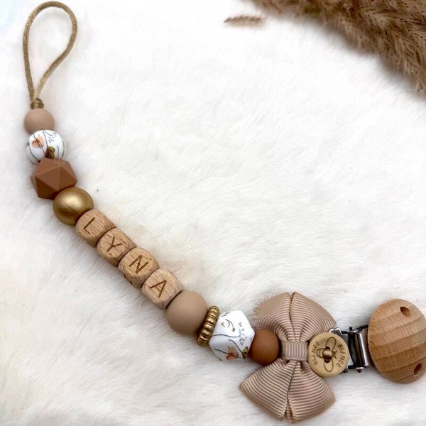 Dit speenkoord van Bij Noe is afgewerkt met een beukenhouten speenclip en beige strik! De siliconen kralen zijn een mix van bruin, zand en bloemen kralen. De letterkralen zijn van beukenhout maar indien gewenst kunnen er ook siliconen kralen gebruikt worden. Naast functioneel is dit speenkoord ook nog eens super trendy!
